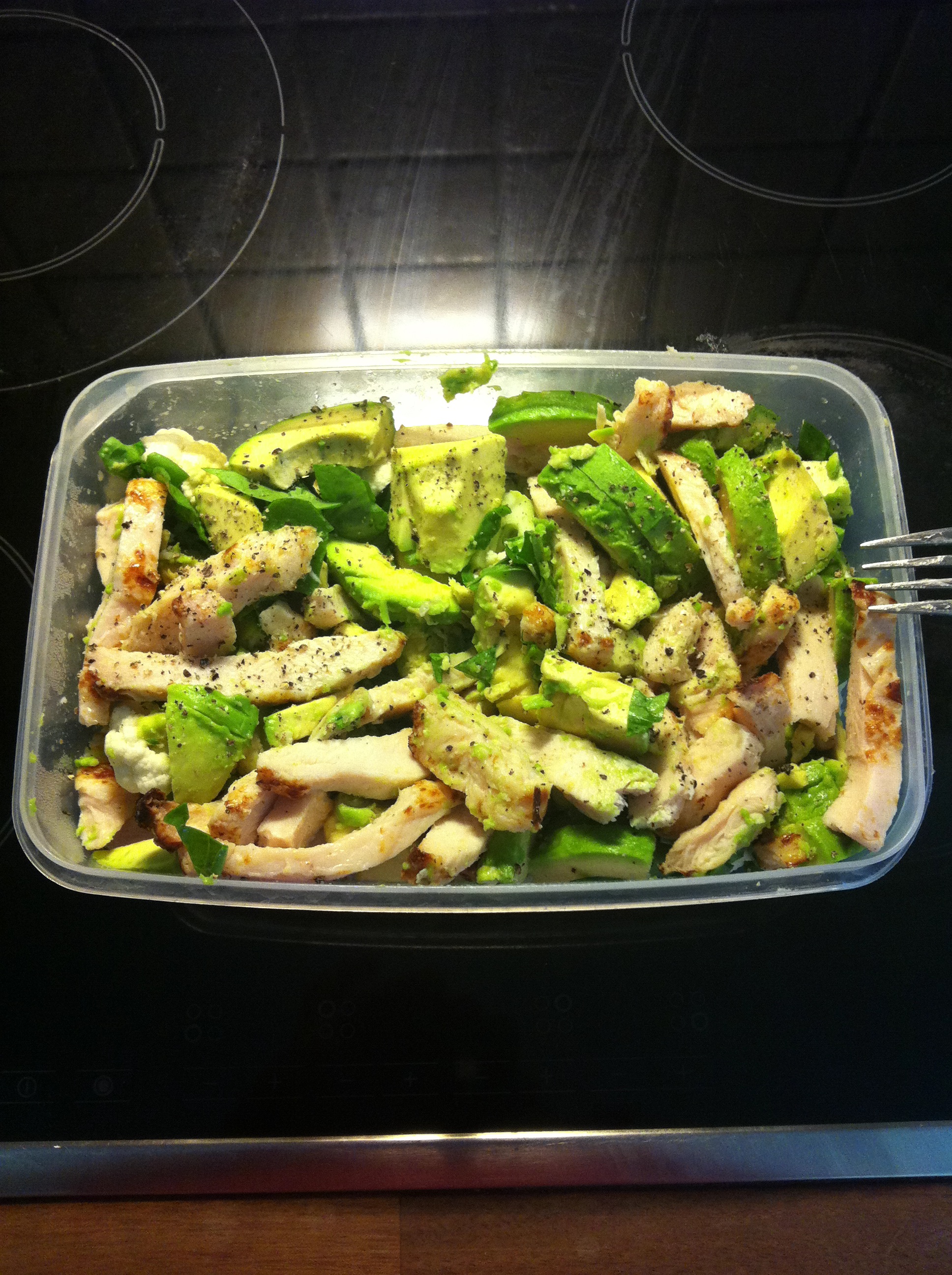 First up is my chicken-cauliflower-avocado dish. The dish almost explains itself, it is just those 3 ingredients mixed in a bowl. I use pre-prepared sliced chicken, bought in 150 gram packaging and I use two of those, for a total of 300 grams of chicken. Then I use one ripe avocado. The best results come when the avocado has gotten slightly soft, so it is possible to mash it. Then finally I use half a head of cauliflower, cut into small pieces. On the picture above I also added a little spinach.