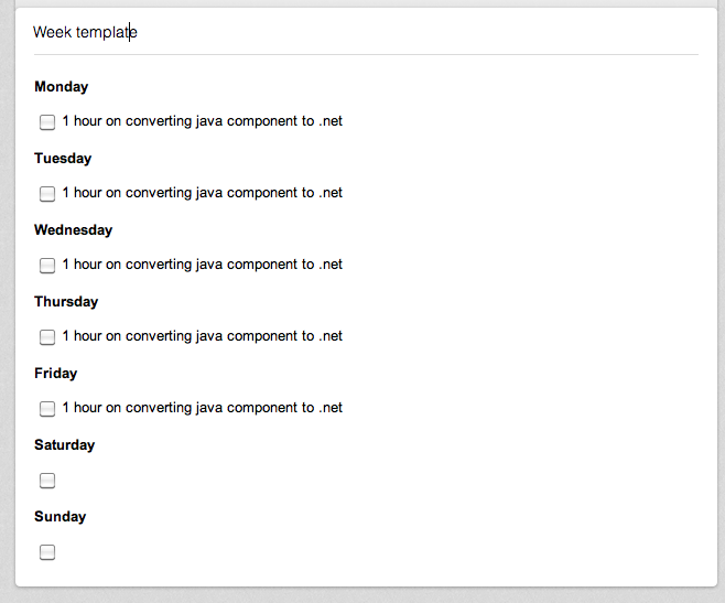 I personally use Evernote to store these and therefore the following screenshots will be from there. I have basically created a note which I call “Week template” – this is almost static. Almost in the sense, that if I have long-running tasks that are not top-priority, they can make their way to this template. This template is then each week copied and used to fill out the week. And example could be as follows: