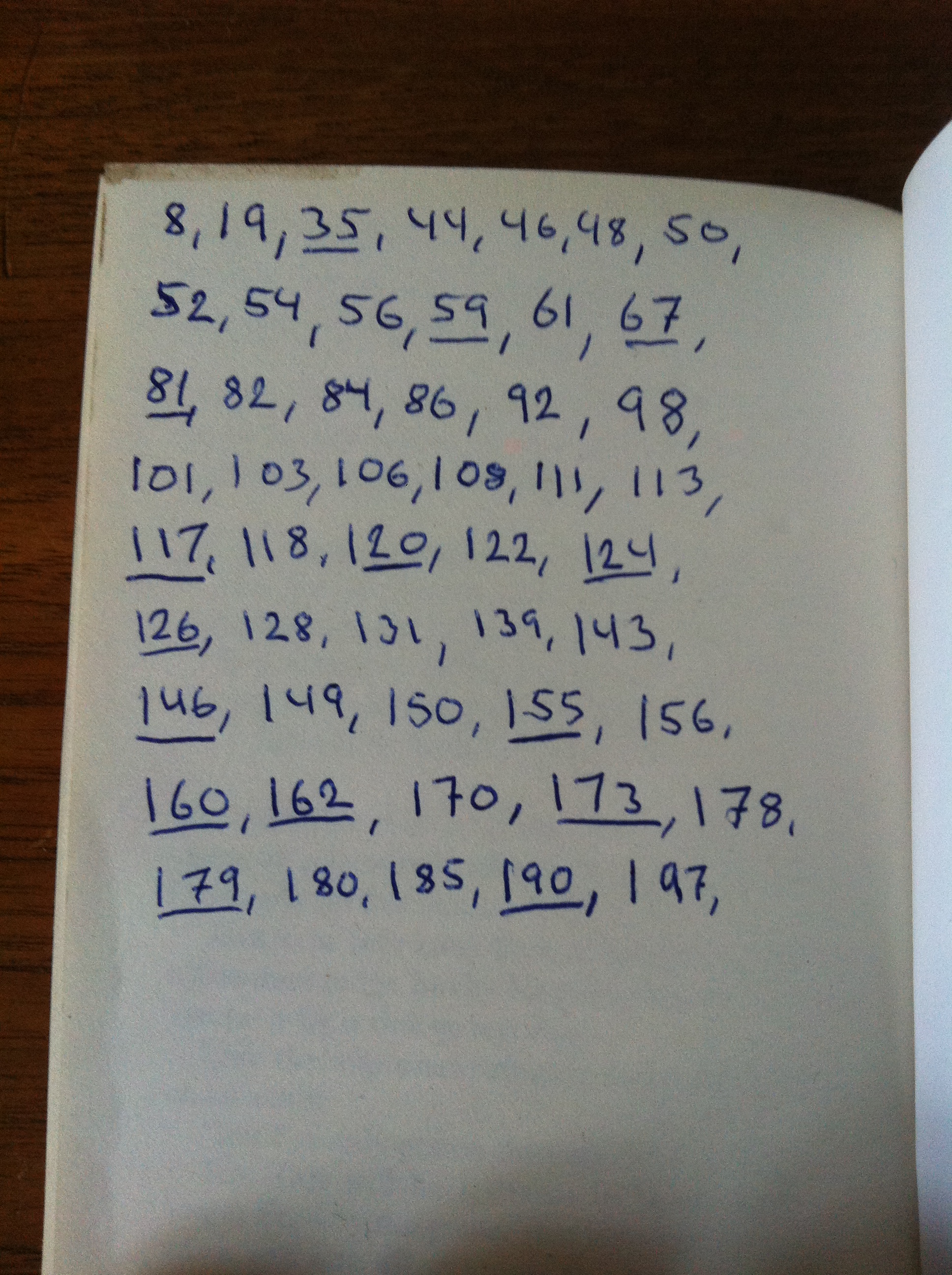 What I started doing then, was every time I made a mark in the book, I would write the page-number in one of the last blank pages in the book. To simplify it a bit further I would only write the number of the left page, if I made marks on both sides and if I hadn’t made any notes on the left, I of course would write the page number of the right one, given that it had any content I marked.